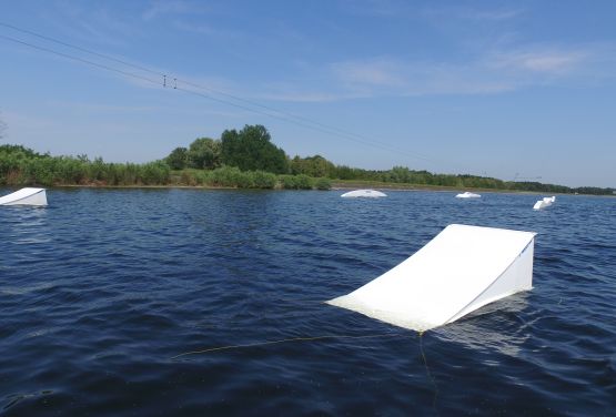 on peut trouver des obstacles comme ça; kicker S, boîte à beurre et quarter pipe. Pour plus d'informations sur le parc de sillage, voir: